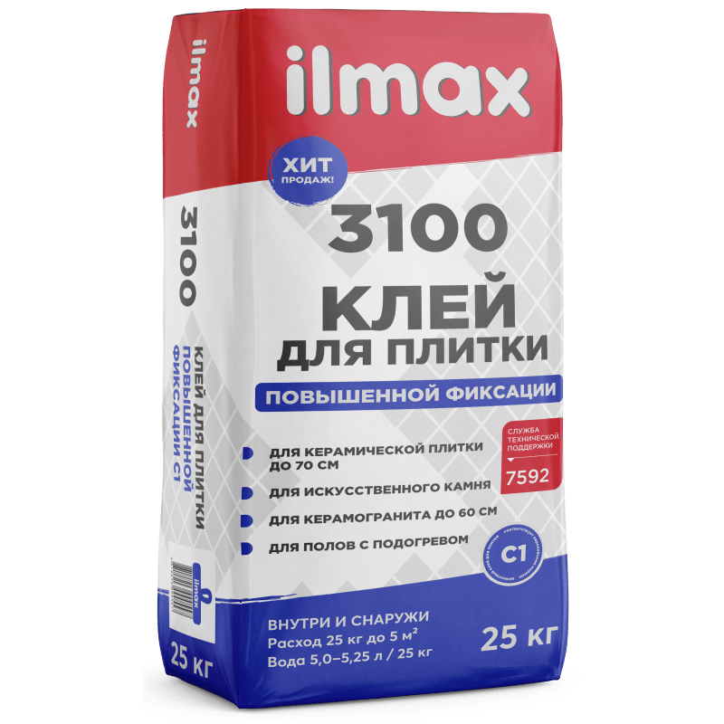 Плиточный клей ilmax 3100 используется для приклеивания: керамических глазурованных и неглазурованных плиток, плит из натурального камня* (кроме мрамора), клинкерных и бетонных плиток, а также плиток из искусственного камня*, в том числе с водопоглощением менее 1%, керамогранитных плиток (ГРЕС) на жесткие, недеформируемые основания внутри и снаружи зданий. Используется на основаниях из следующих материалов: цементные и цементно-известковые штукатурки и стяжки (в том числе полы с подогревом); бетон; кирпич и блоки из ячеистого бетона. Рекомендуется применять для облицовки поверхностей, подверженных периодическому воздействию влаги (общественные душевые, сауны, бани), интенсивным нагрузкам (коридоры, лестничные площадки и марши, офисные помещения и другие места общественного пользования), а также снаружи зданий и в помещениях с низкими температурами, в том числе морозильных камерах.