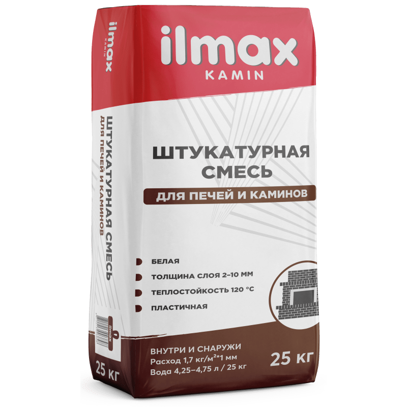 Штукатурная смесь для печей и каминов. Для оштукатуривания конструкций, подверженных нагреву (печи, камины, барбекю, мангальные зоны, тандыры, дымоходы), из шамотного (огнеупорного) и печного (керамического) кирпича. Температура эксплуатации до +120°С. Внутри и снаружи. РСС, штукатурная НВ (более 5 мм), цементная, М75, F50, Пк2, St-3 «ilmax kamin штукатурная» СТБ 1307-2012