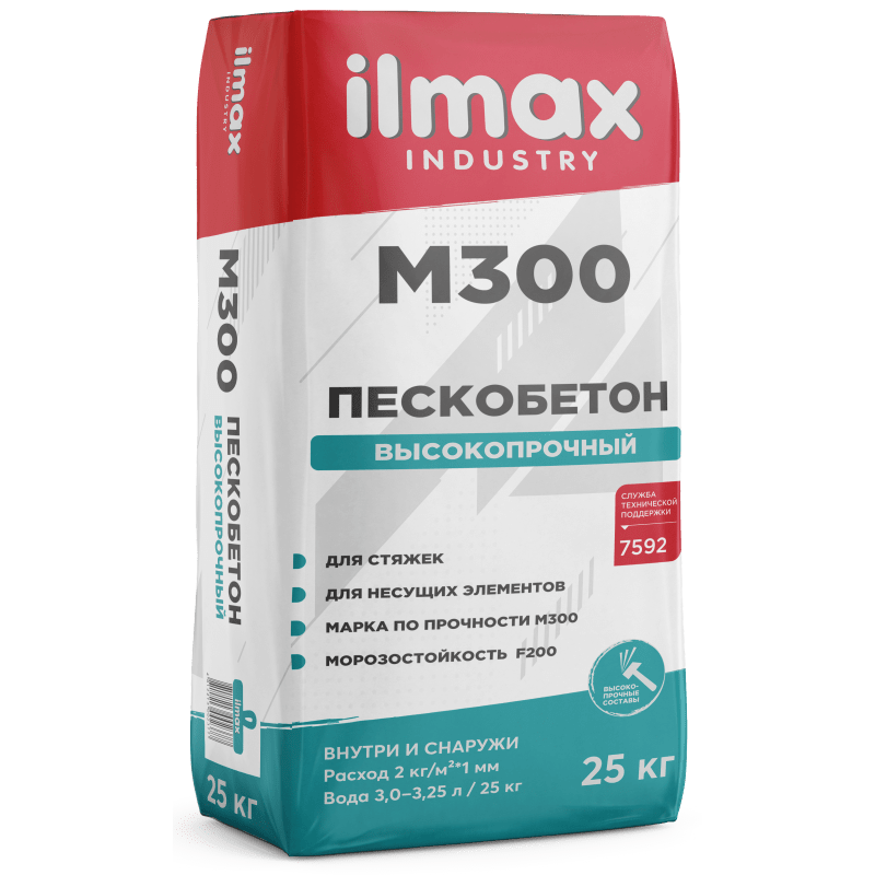 ilmax industry стяжка М300 используется для устройства стяжки пола толщиной 20-100 мм, под облицовку керамической плиткой, заливку самонивелирами. Водостойкая, морозостойкость 200 циклов. Расход — 18-20 кг/м2*1 см. Время использования раствора, не более 1 часа. Марка по прочности — М300. Количество воды на 25 кг — 3,25-3,5 л. Вес — 25 кг.