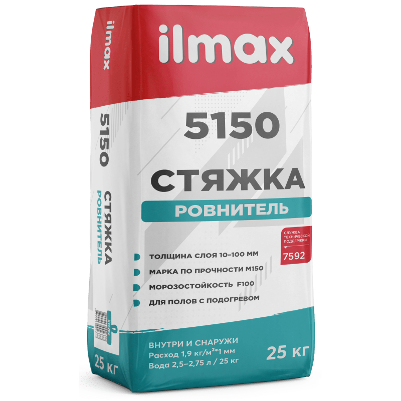 Смесь ilmax 5150 применяется для стяжки пола толщиной 10-100 мм, подходит под различные виды напольных покрытий (ламинированные полы, облицовка керамической плитки, под заливку самонивелирами). Используется для наружных и внутренних работ. Расход материала на 1 м2-1,8 кг. Нанесение рекомендуется при температуре +5 до +25 С. Готовый раствор следует использовать в течении 1 ч. Прочность на сжатие: 15 Мпа, полностью высыхает за 12 ч. Поставляется в мешках по 25 кг.